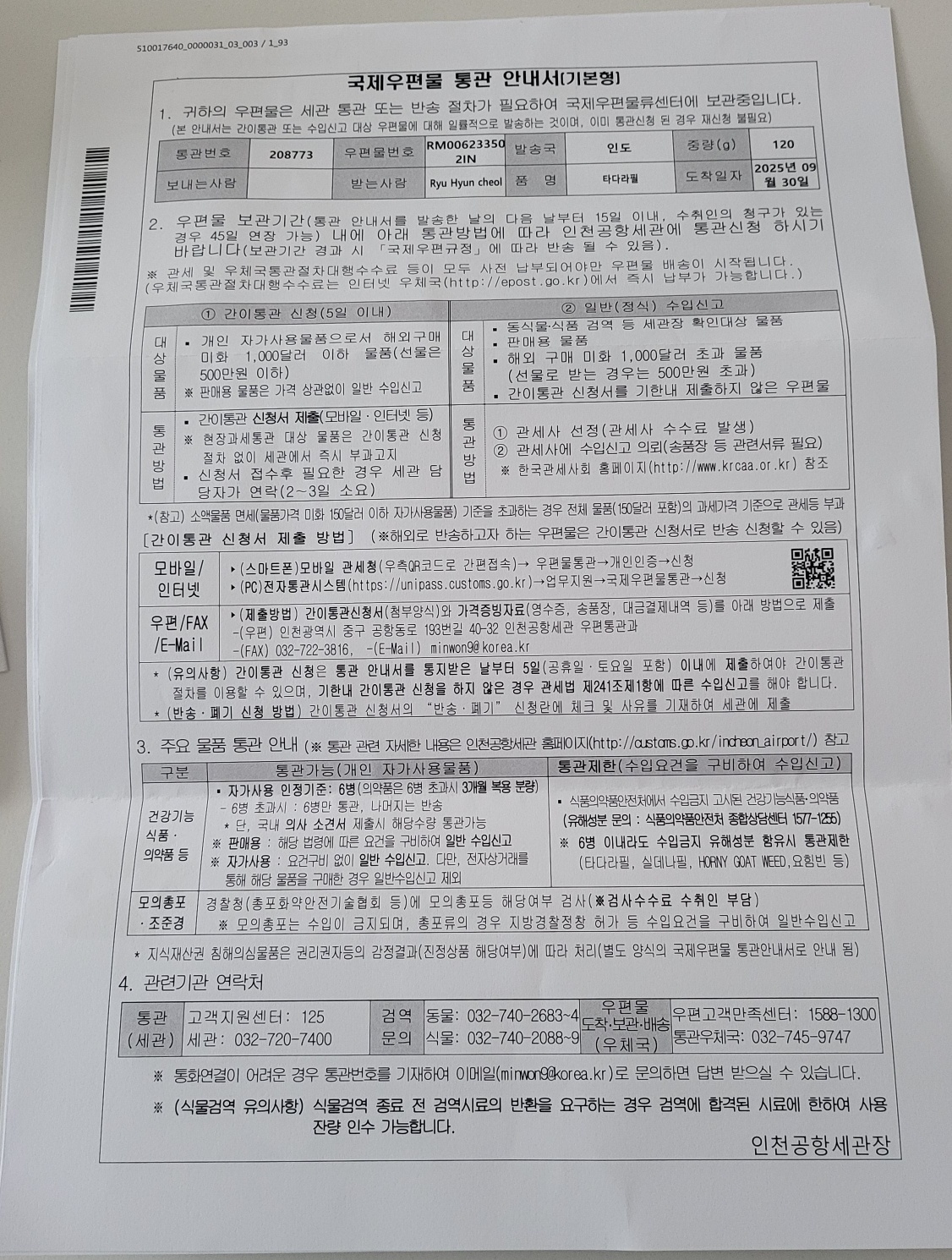우체국에서 “국제우편물 간이통관 신청서” 를 등기로 받았습니다. 제가 받는 5mg 은 우편물번호가 RM006233652IN 인데 등기로 받은 우편물 번호는 사진첨부와 같이우편물 번호를 보면 RM006233502IN 입미다 해당 번호가 10mg 으로 추정되는데